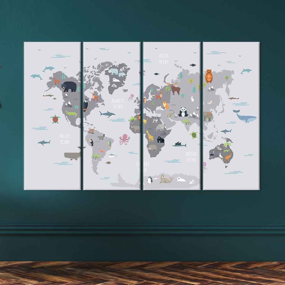 Printed Canvas: World Map with Animals Wall Decor for Kids,4P: Gallery Wrapped