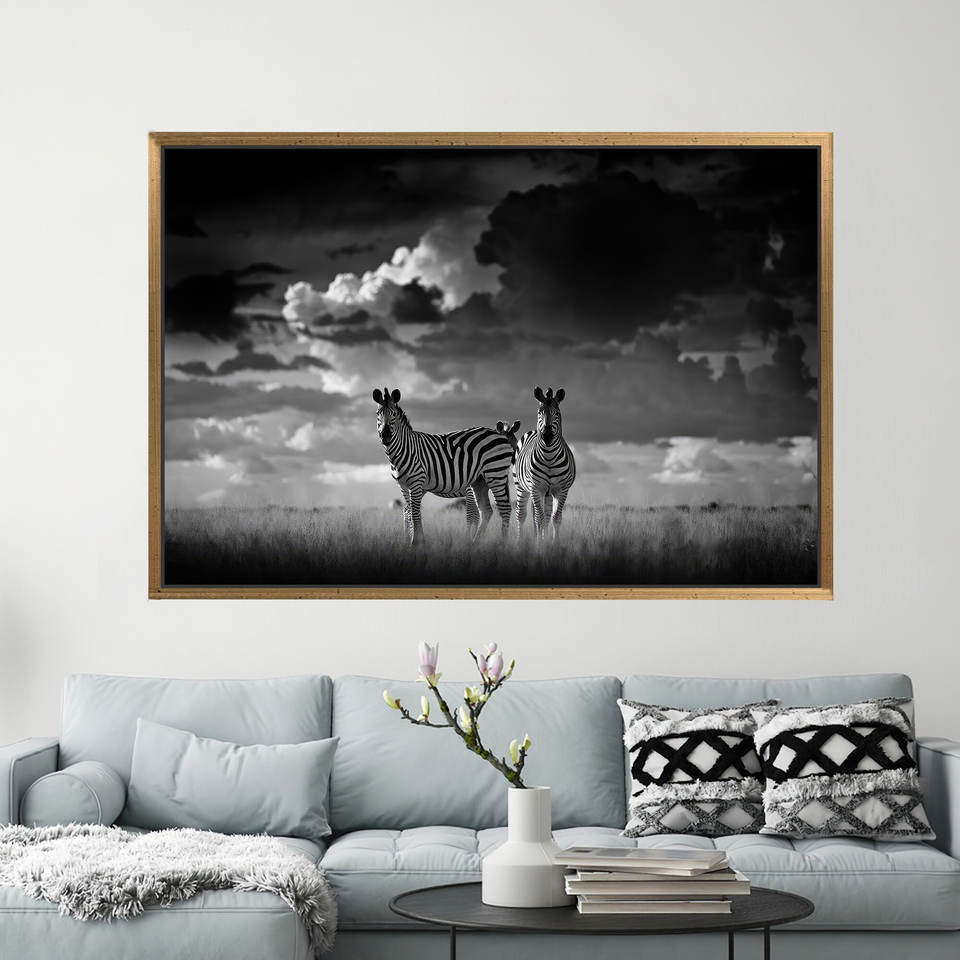 Printed Canvas: Zebra Art, African Savannah Wall Decor, Elegant Living Room Art,1P:Gold Framed
