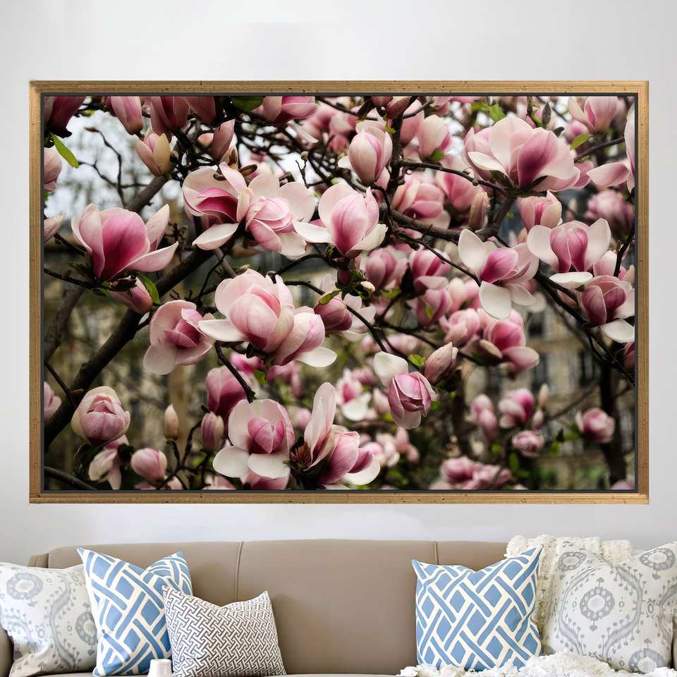 Printed Pink Magnolia Canvas Artwork for Elegant Home Decor,1P:Gold Framed