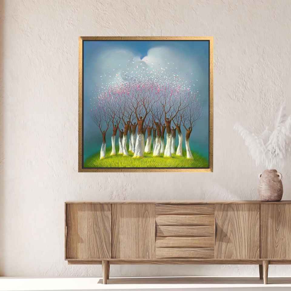Printed Surreal Tree People Canvas Wall Art, Blossoming Fantasy Forest,Gold Framed