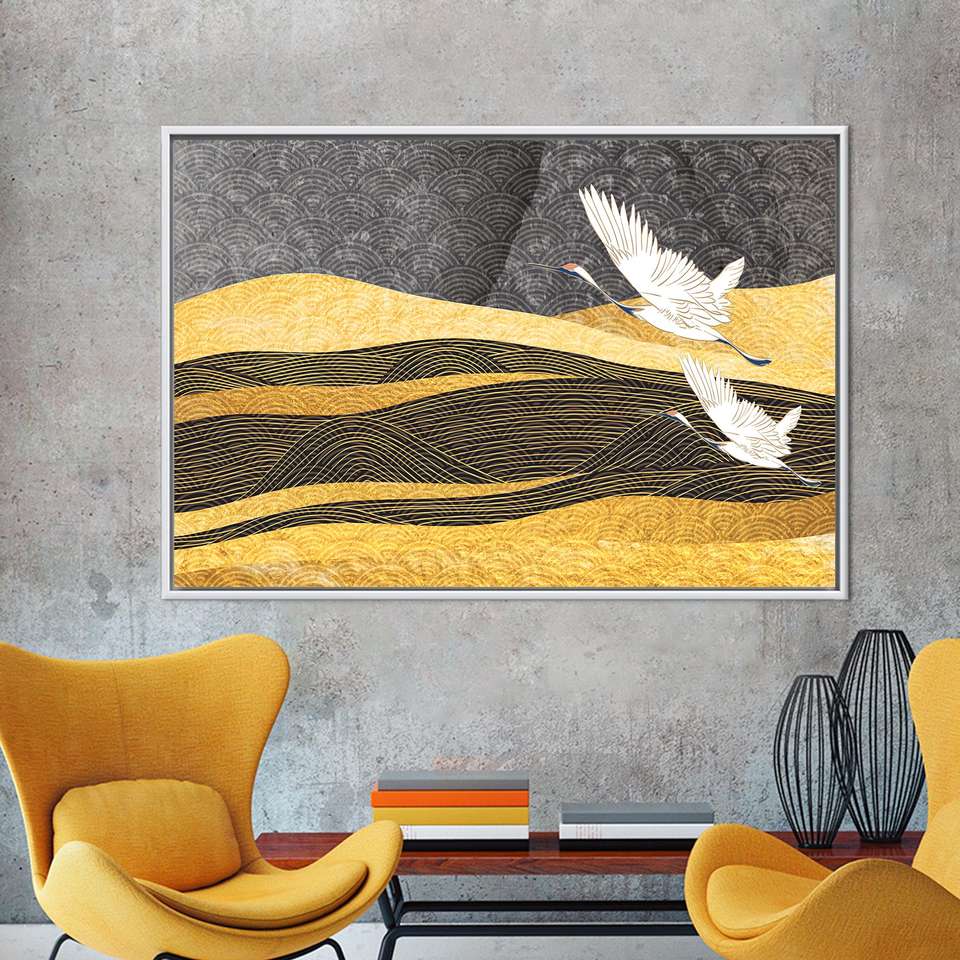 Printed Two Storks Flying Art Canvas, Modern Yellow Pattern Decor,1P:White Framed