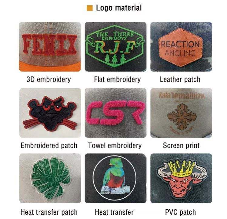 Logo position:brim/visor, front panel, Left panel, Right Panel, back curved part