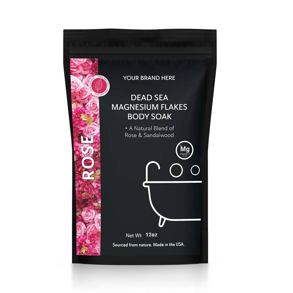 Private Label 12oz USA-Made Bath Flakes Organic Dead Sea Magnesium Chloride Rose Radiance Skin Soothing Nutrient-Infused Bathing