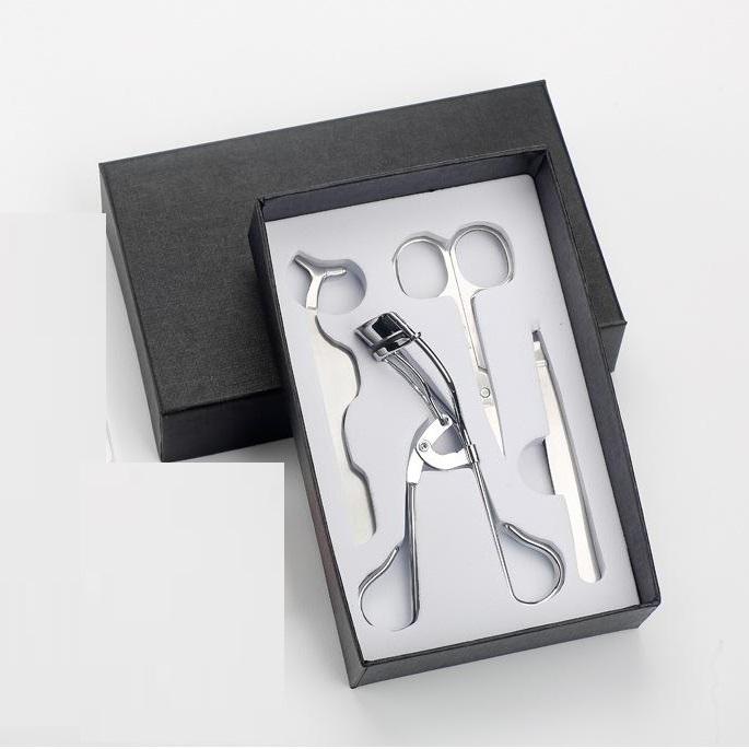 Private Label Silver Makeup Tools Kit Eye Lash Curler Tweezer and Scissor Set 4 in 1 Eyelash Tools Set