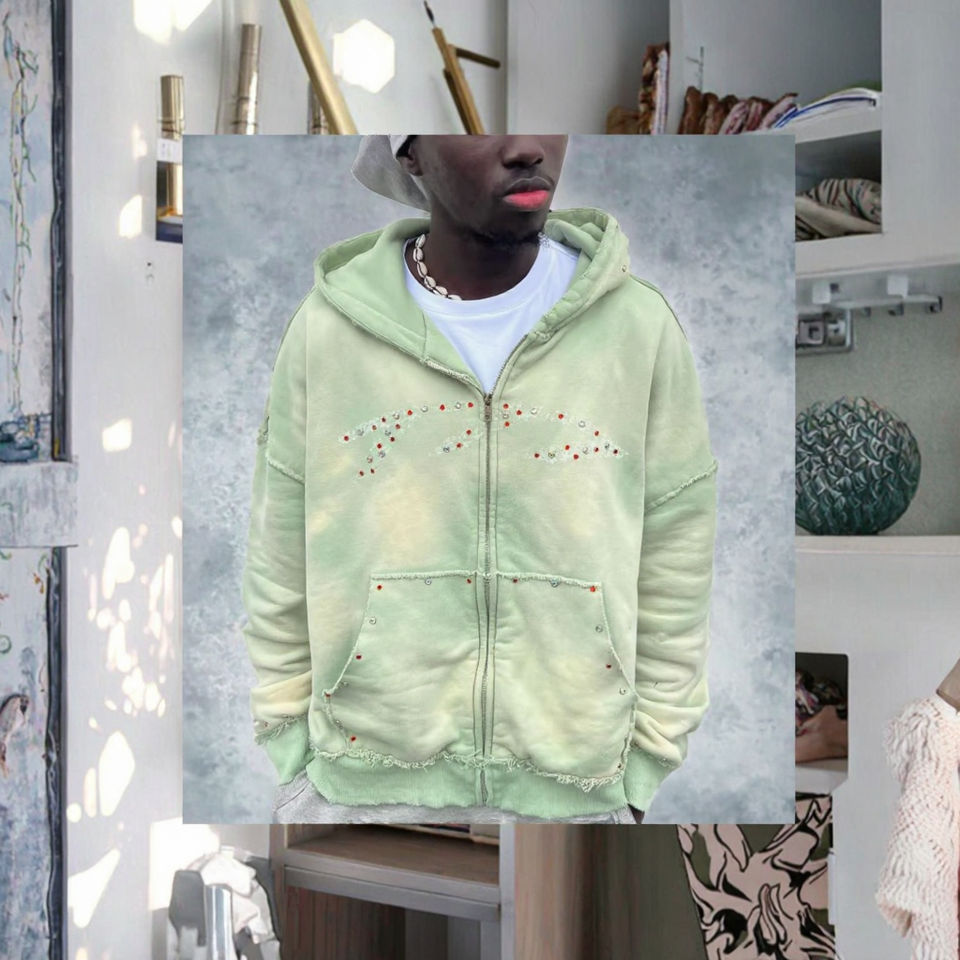 Private label Custom Men Long Oversized Vintage 500GSM Cotton Fleece Zipper-Up Acid Wash Distressed Sun-Faded Rhinestone Hoodie