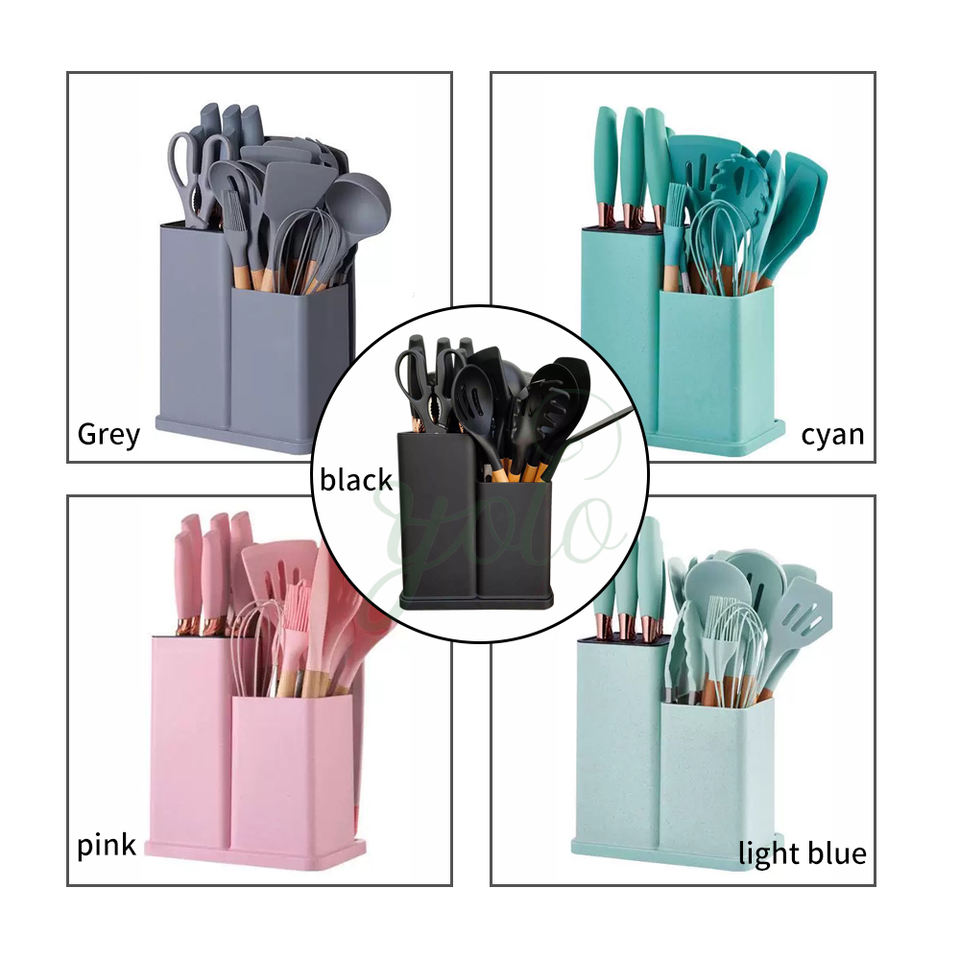 Silicone Baking Spoon Tools Wooden Cooking Utensils Set with Holder