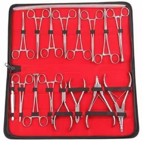 Professional 16-Piece Premium Quality Stainless Steel Body Piercing Tools Kit Veterinary Surgical Instruments Leather