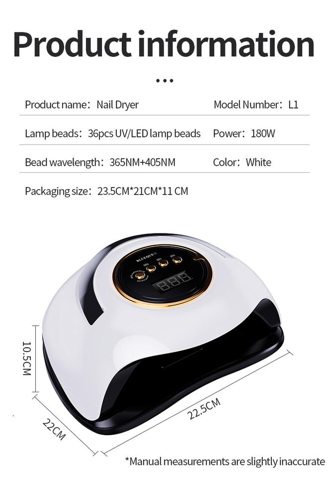 Professional 180W Nail Dryer UV+LED Technology Induction Start LCD 4 Timers Large Metal Space for Salon-Grade Battery UV Lamp