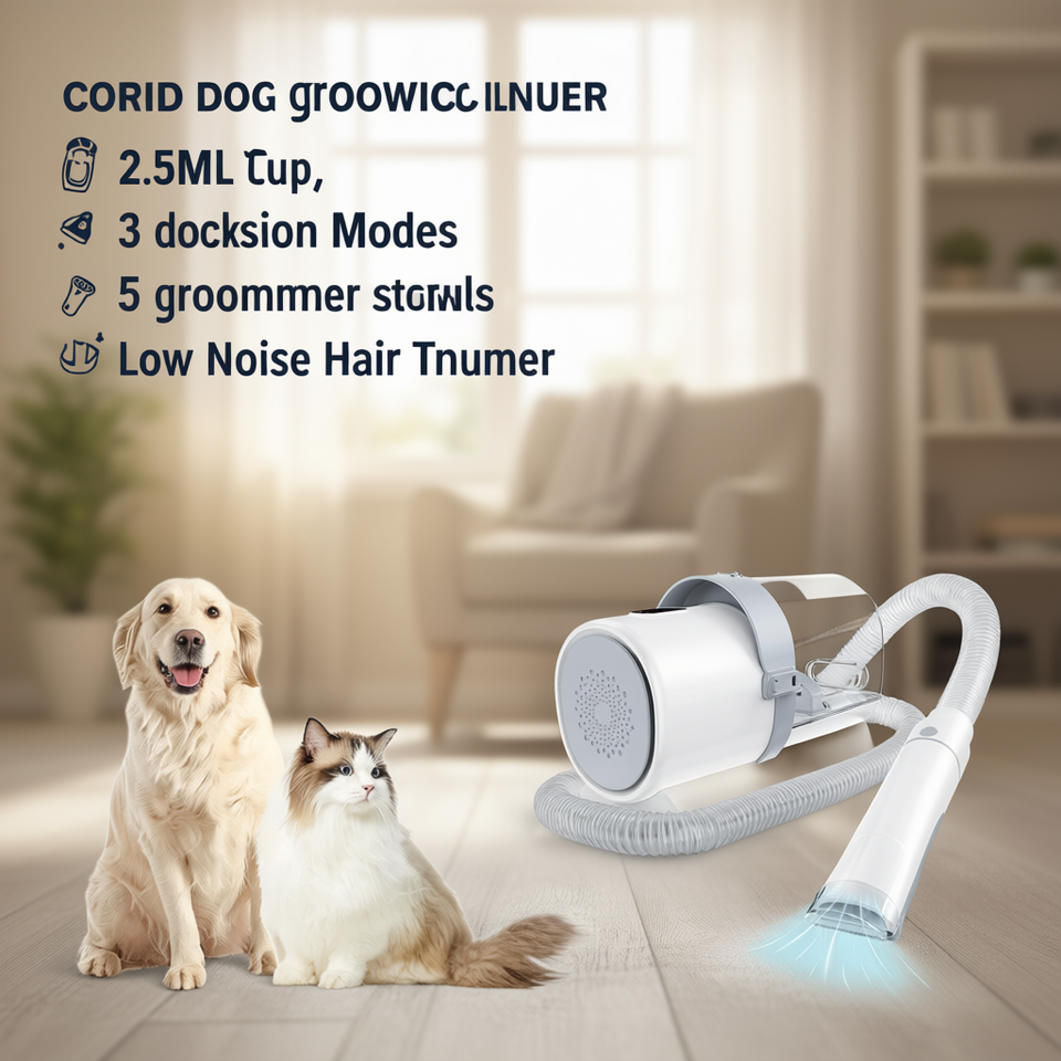 Professional Cordless Dog Grooming Clippers with 2.5L Cup, 3 Suction Modes, 5 Groomer Tools, Low Noise Pet Hair Trimmer for Smal