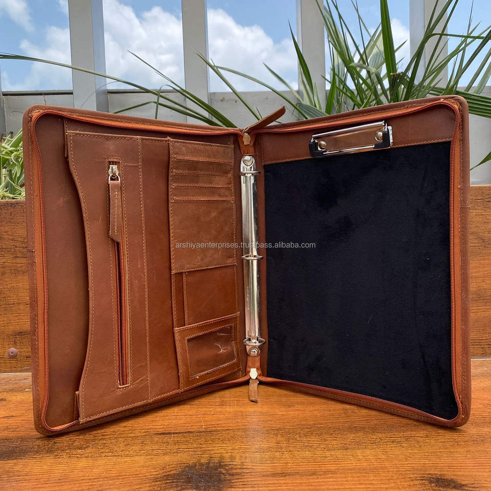 Professional Custom Top Quality Genuine Hand Tooled Leather Business Portfolio File Folder A4 Document Binder With Card Holder