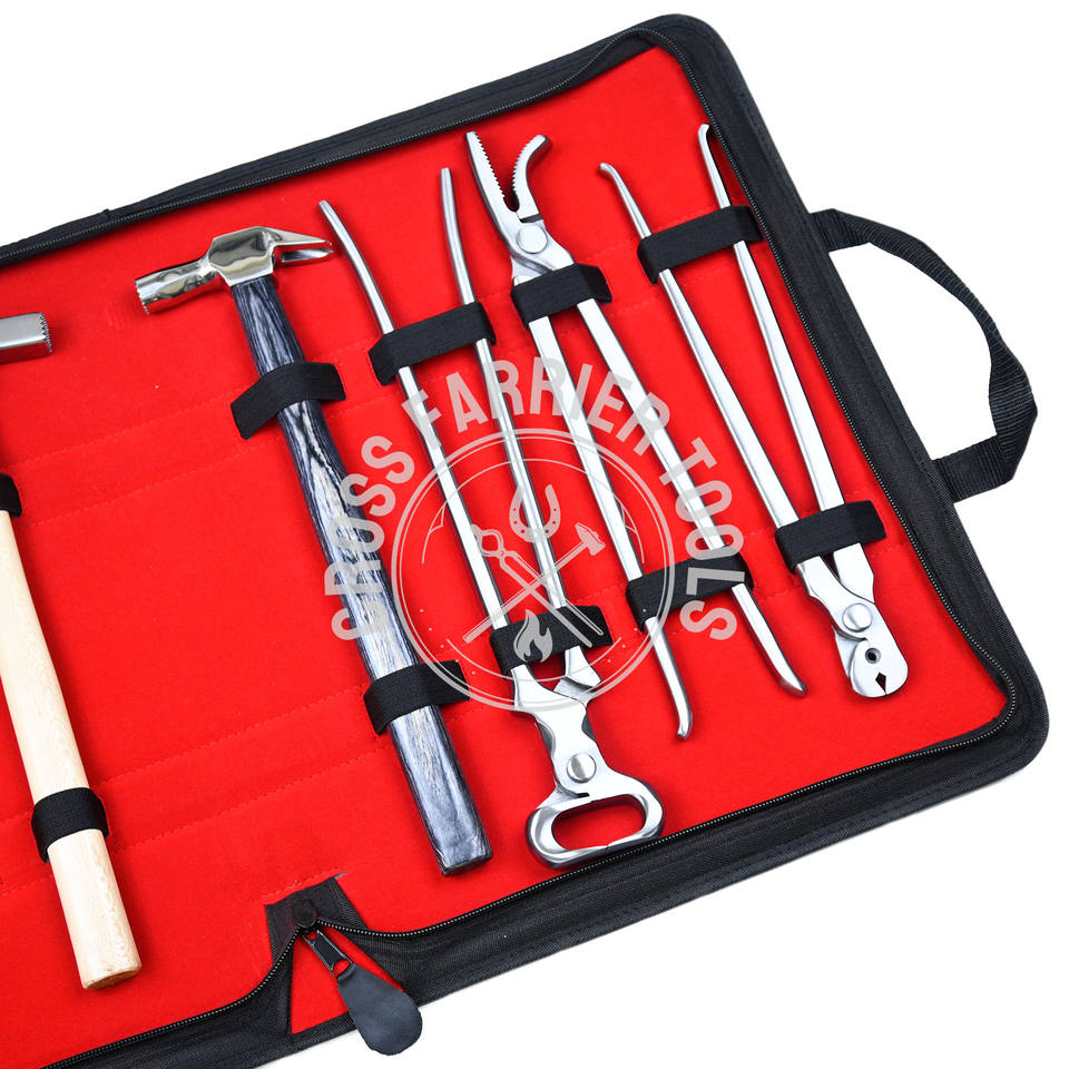 Professional Equine Horse Farrier Veterinary Instrument Kit Carry Bag 4 Hoof Trimming Knives Buffer Tool Clincher Shoe Hammer