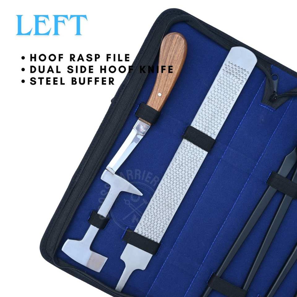 Professional Farrier Tool Set Black Nail Puller Hoof Nipper Steel Buffer Dual Side Sharp Blade Knife Rasp File and Rexine Case