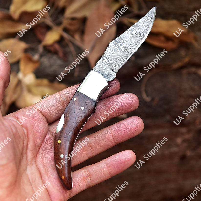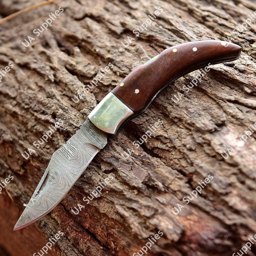Professional Handmade Damascus Steel Utility Folding Pocket Knife Outdoor Hunting OEM/ OBM Back Lock Pakka Wood Handle DIY Grade