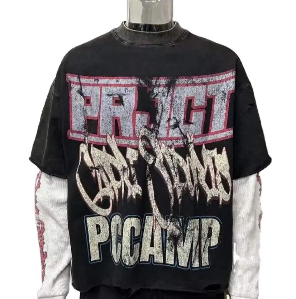 Professional Hot Sale Custom Print 300 Gsm Boxy Cropped Men Double Layer Long Sleeve T Shirts With Thermal Waffle Sleeves