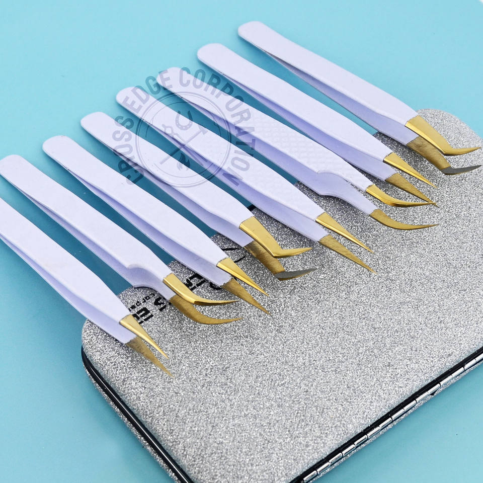 Professional Lash Extensions Tweezer Straight Pointed Fiber Tip Glitter White with Gold Tip Russian Individual Tweezers