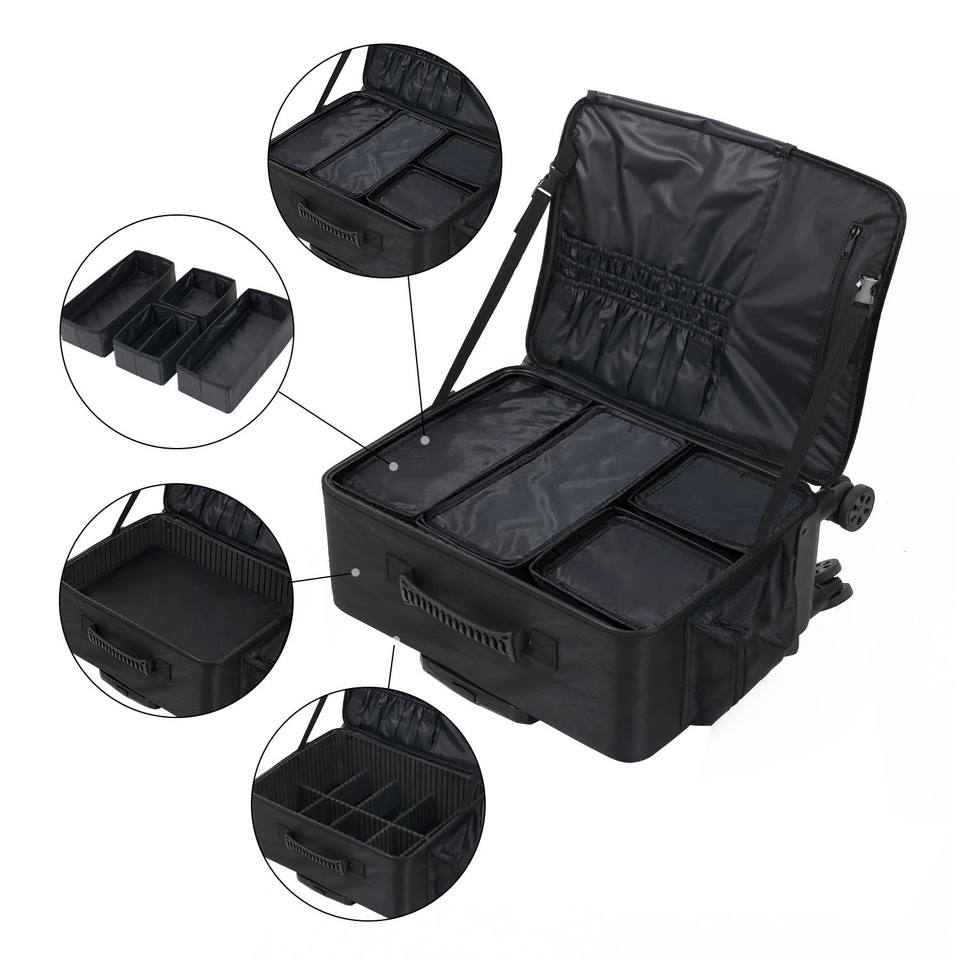 Professional Makeup Case With Dividers 20-35L Oxford Cloth Trolley Bag For Home Storage Black Solid Color