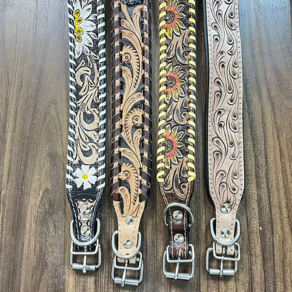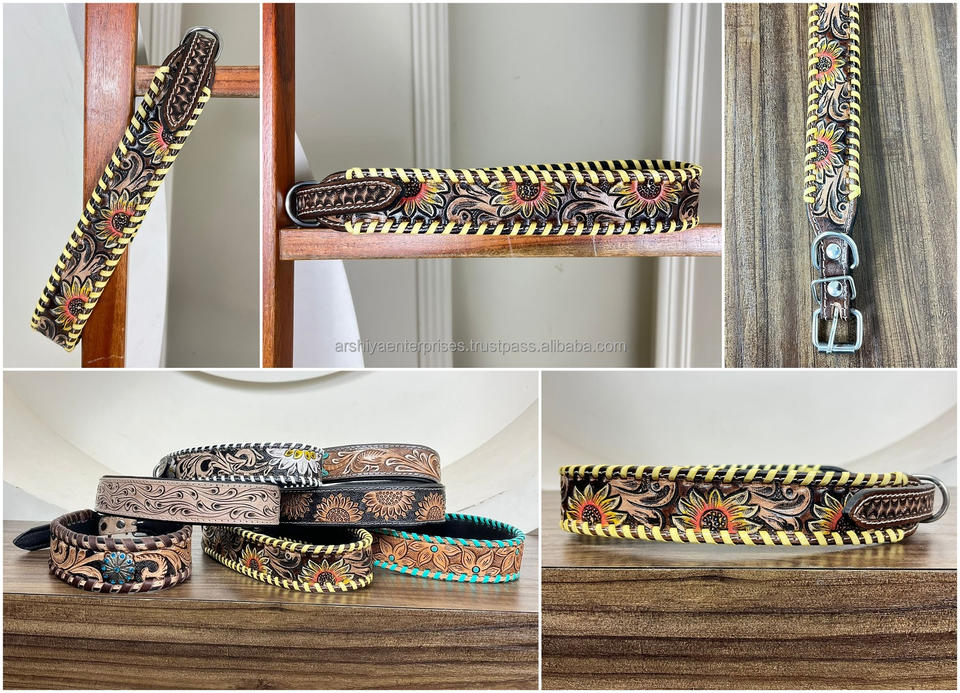 Professional Manufacturer's Luxury Hand Tooled Leather Dog Collar Genuine Leather Western Sunflower Pattern Adjustable Collars