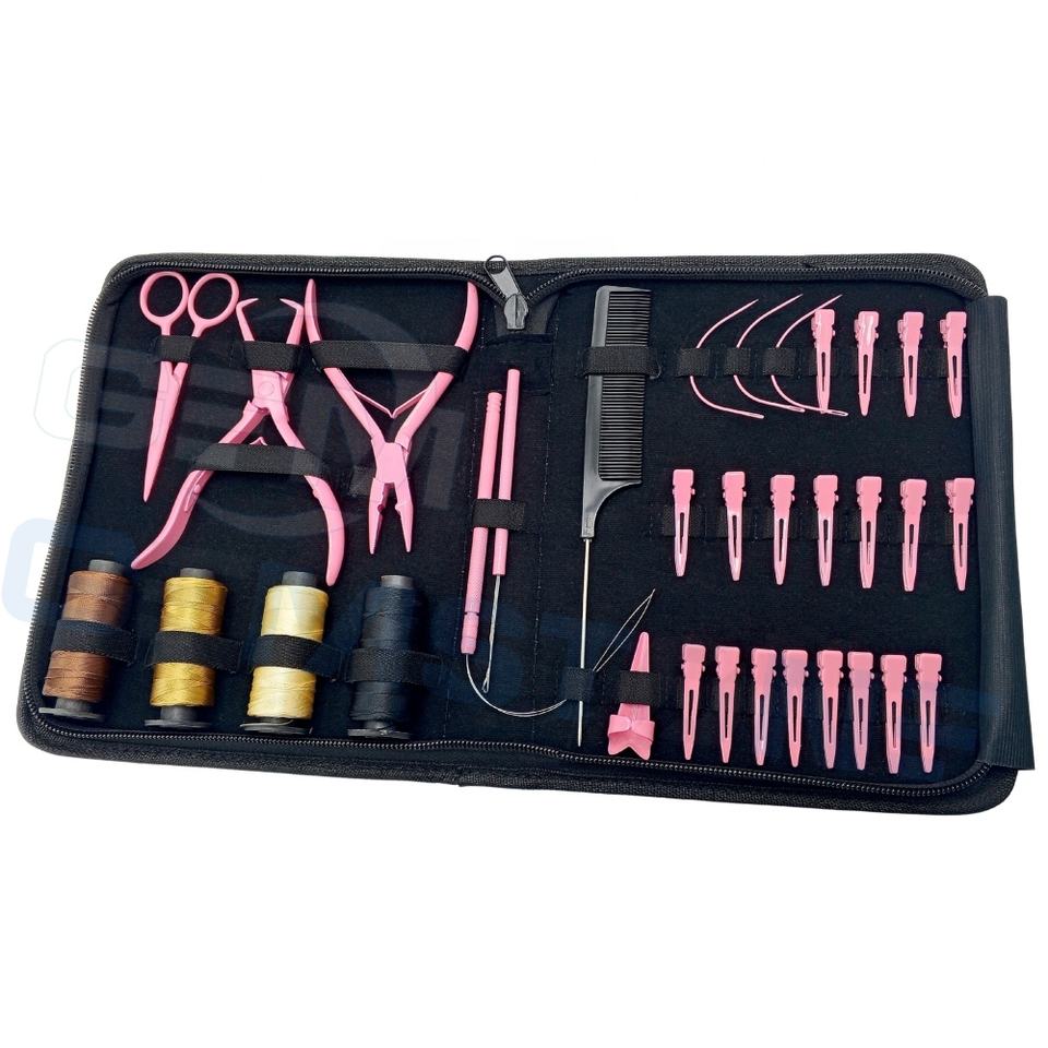 Professional Pink Hair Extension Installation Tool Kit with Micro Bead Pliers, Loop Hook, Section Clips & Threads Tools set