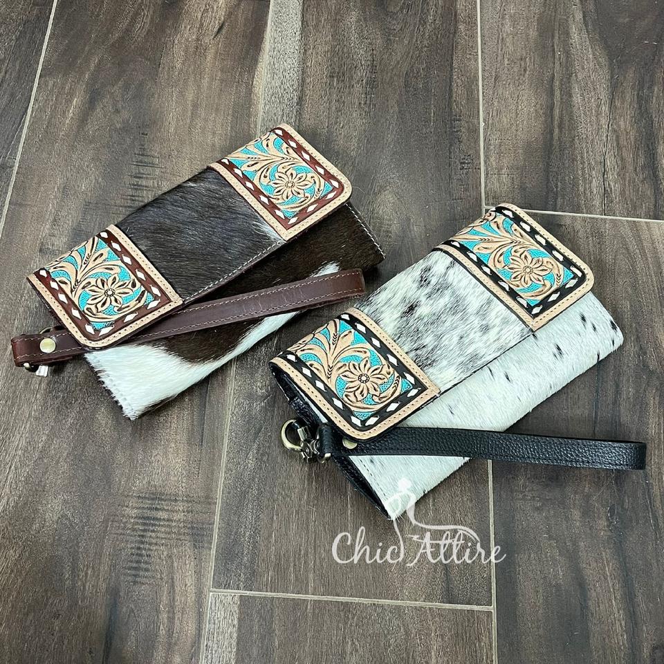 Hand Tooled Cowhide Leather Wristlet Clutch Purse
