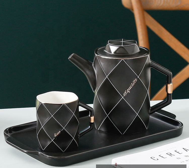 Promotional Diamond Pattern 6pcs Ceramic Tea Set Ceramic Pot and Mug with Tray