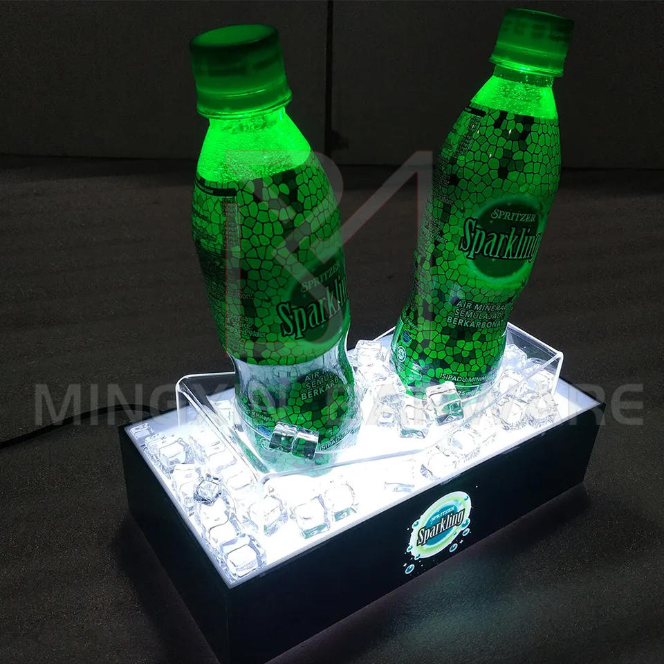 Promotional LED Beverage Display Ice Cube Themed Double Bottle Stand with Lights for Brand Promotion and Commercial Hospitality