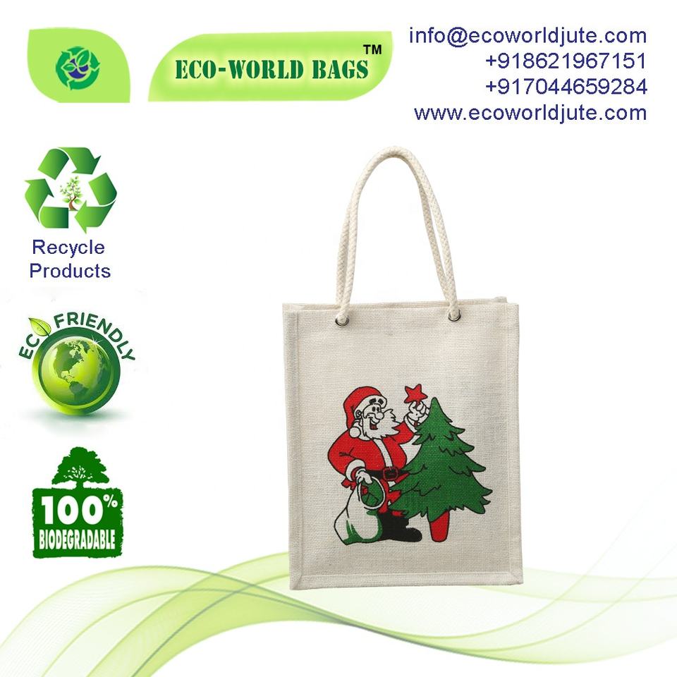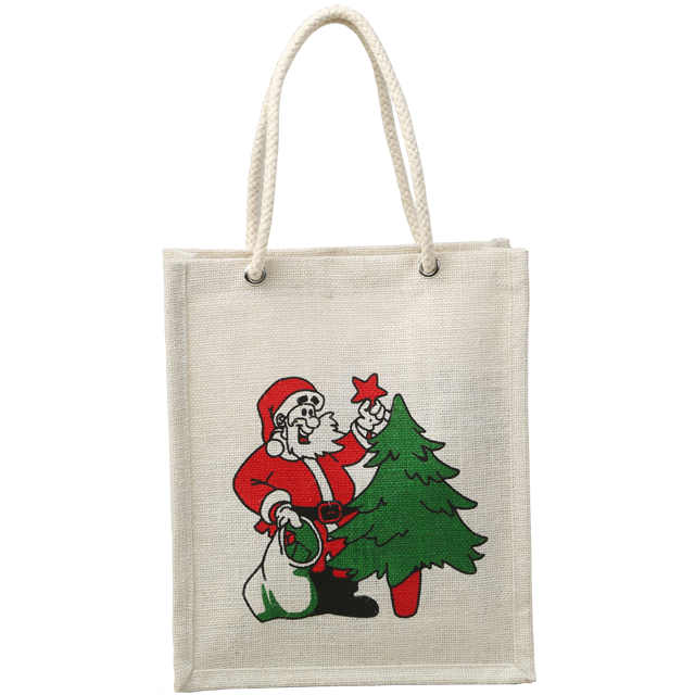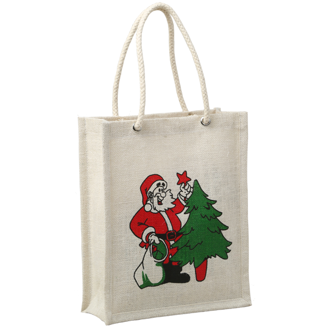 Promotional Jute Shopping Bags with Santa Printed Laminated with Weaved Padded Handle Novation Bags Affordable Price