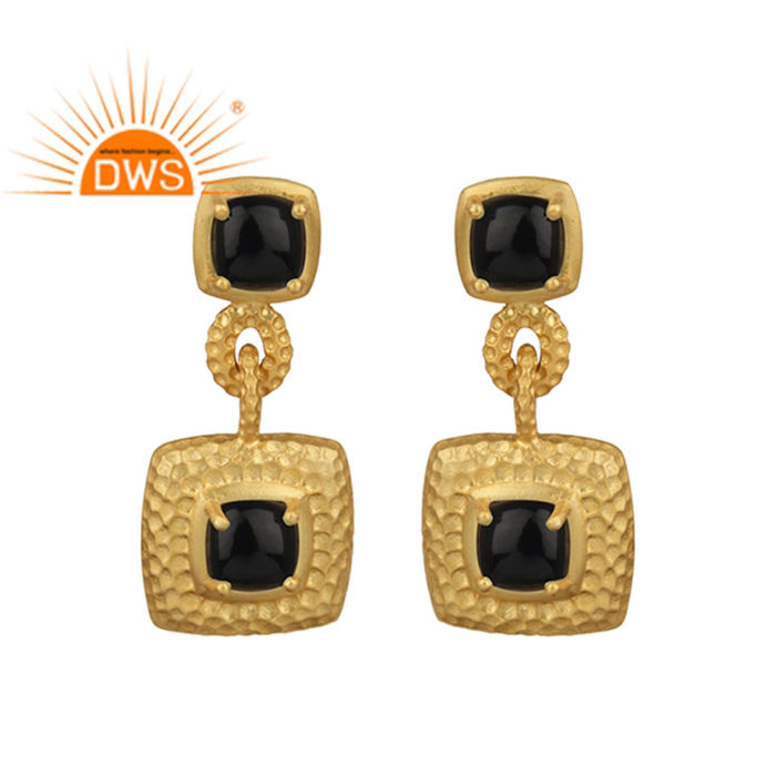 Prong Set Black Onyx Gemstone Earrings Supplier Gold Plated Textured 925 Silver Dangle Earrings Jewelry Classic Collection