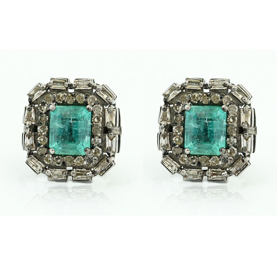 Prong Set Natural Emerald Gemstone Oxidised 925 Silver Designer Pave Diamond Unisex Stud Earrings Push Back Jewelry Wholesale