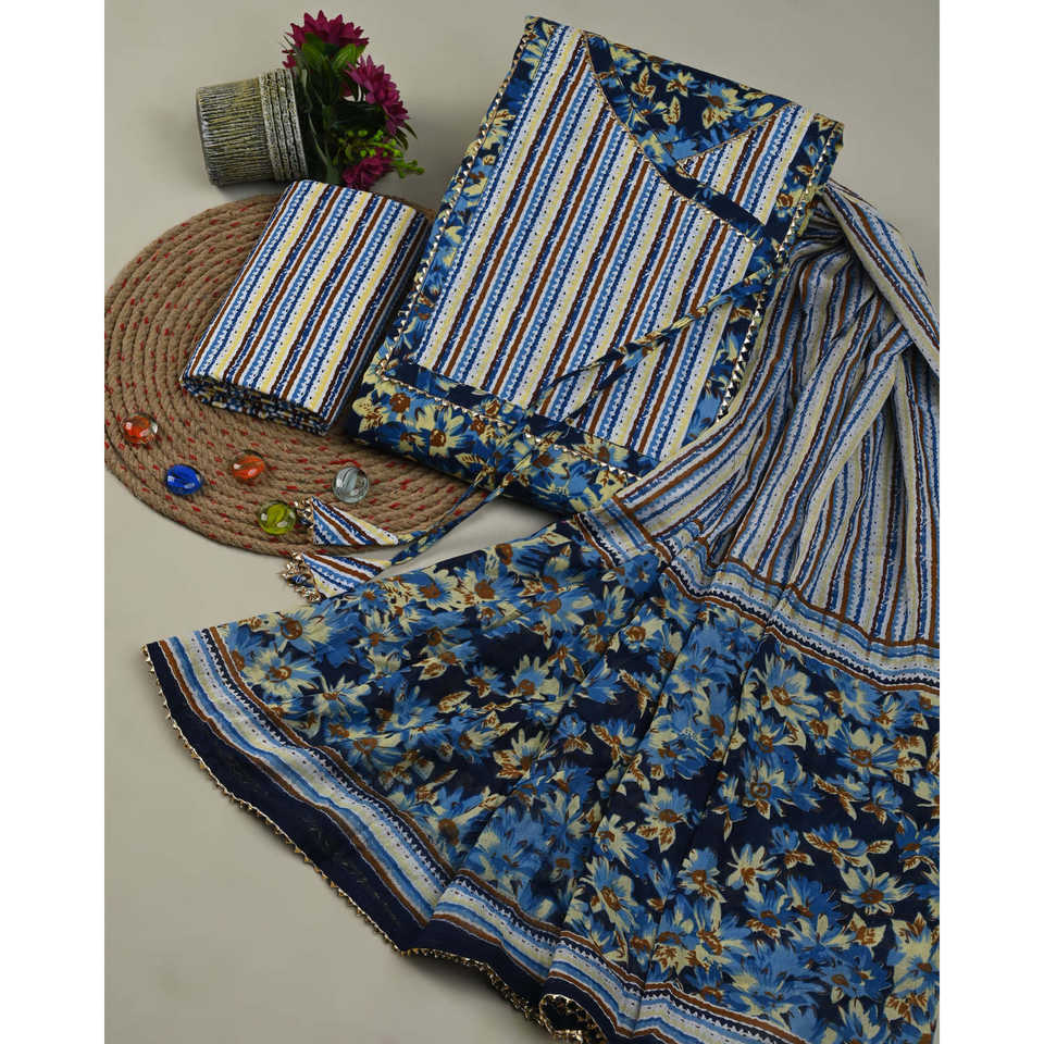 Prussian Floral Printed Pure Cotton Unstitched Dress Material Gota Work Angrakha Style Free Size (SHKS1208)