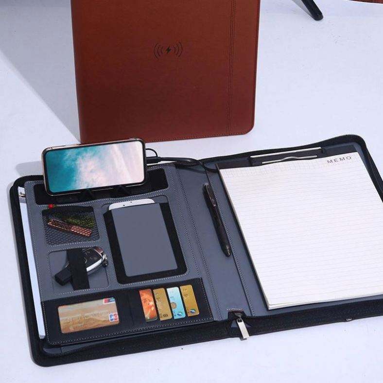 Pu Leather A4 Multi-function 8000 MAh Charging Bank Manager Clip Mobile Power Charging Business Office Gift Zipper Bag Custom