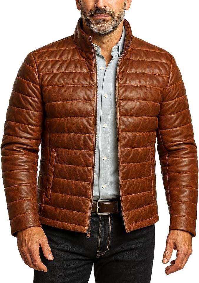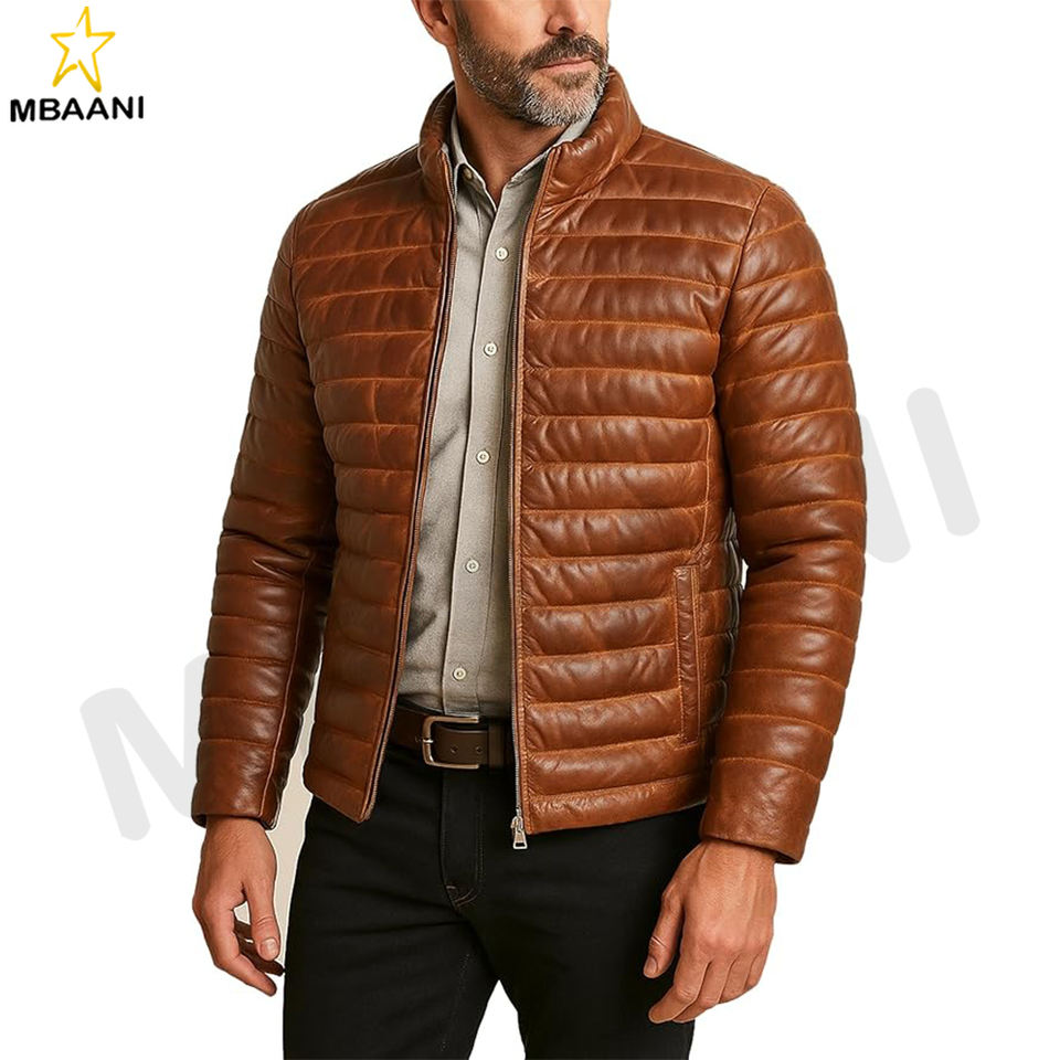 Puffer Lambskin Leather Jacket Distressed Brown Quilted Bomber Coat, Slim Fit with Stand Collar & Side Pockets For Men.