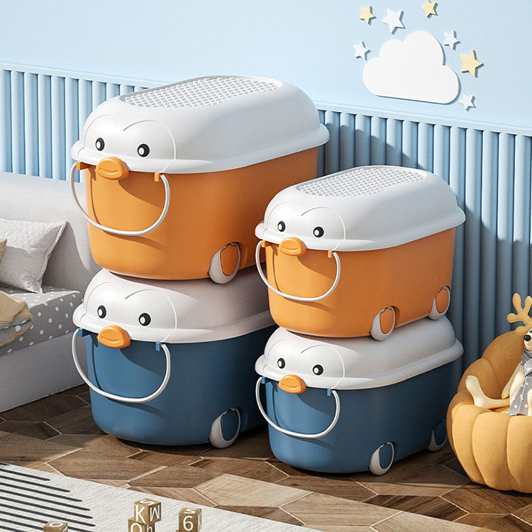 Pull-along Cartoon Duck Style Toy Box with Building Block Lid Rolling Storage Bin with Wheels Handle & Puzzle Top for Lego Duplo
