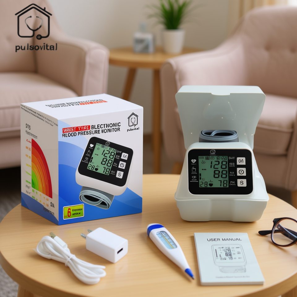 Pulsovital Wrist Blood Pressure Monitor With LCD Display, Portable Electric Medical Device, ISO13485 Certified, Plug-In Power Su