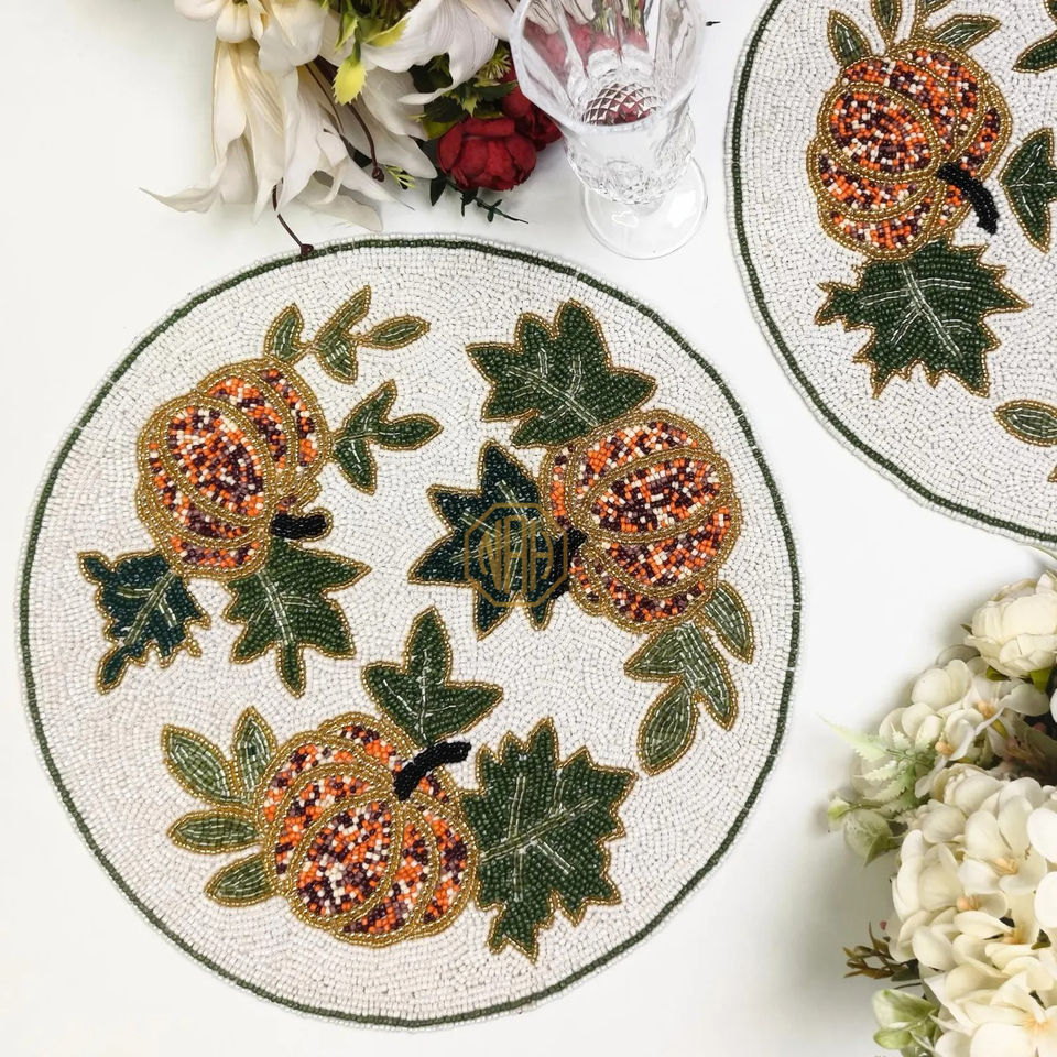 Pumpkin Handmade Beaded Placemat, White and Black Beaded Charger, Round Table Mat, Embroidered Centerpiece Gift
