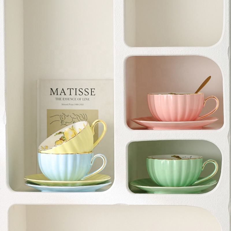 Pumpkin Shaped Floral Coffee Tea Cup and Saucer Set European Macaron Colors Ceramic Cups Porcelain French Afternoon Teacups Set