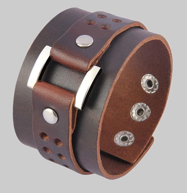 Punk Rock Black & Brown Genuine Leather Bracelet Metal H Leather Cuff Wristband Men Wide Leather Bracelets Modern Design