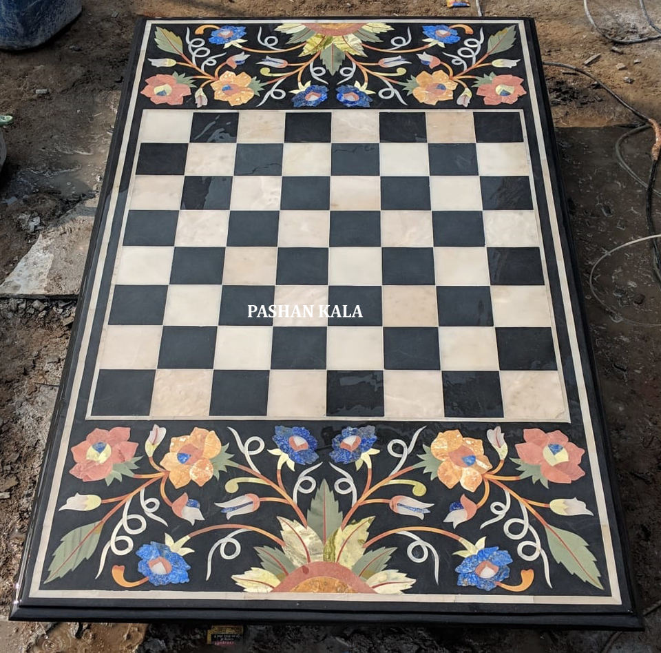 Pure Black Marble Floral Inlay Design Dining Table Top Rectangular Shape For Home And Restaurant Decoration Purpose Manufacturer
