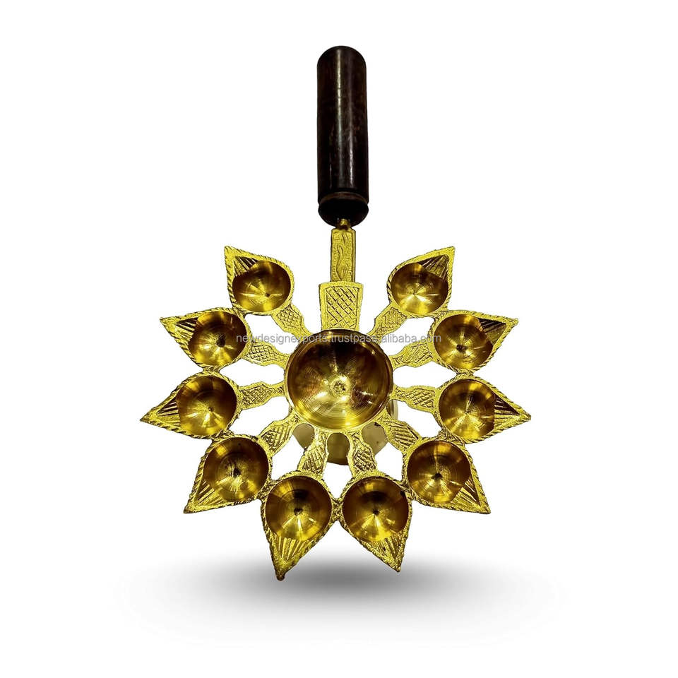 Pure Brass Aarti Diya with Wooden Handle 10 Bati Traditional Puja Lamp Handmade Pital Aarti for Home Temple, Festivals & Gifting