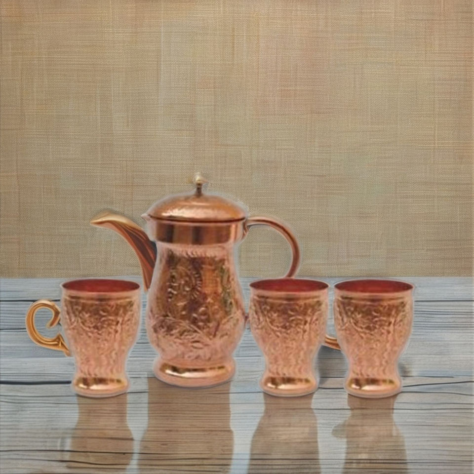 Pure Copper Embossed Antique and Vintage Design Water Pitcher With Set of 3 Tumblers Top Selling and High Quality