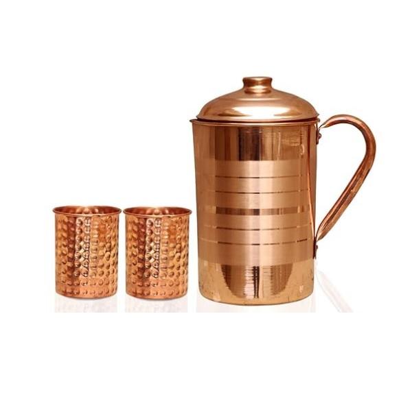 Pure Copper Jug Hammered Finished With Brass Knob & 2 Copper Glass for Serving Water Home Kitchen Use