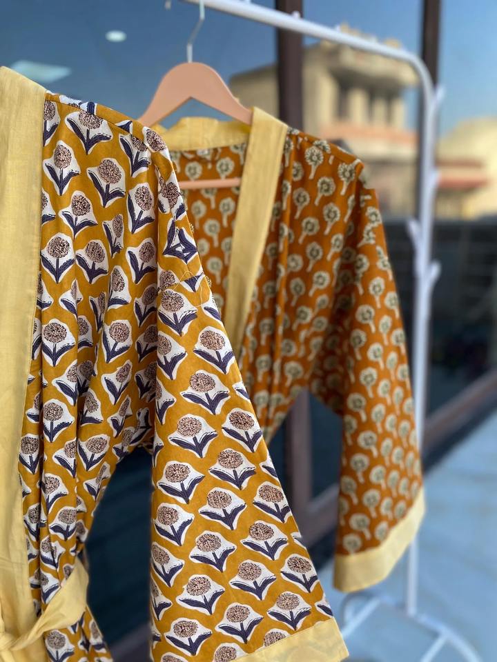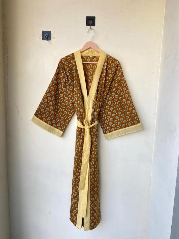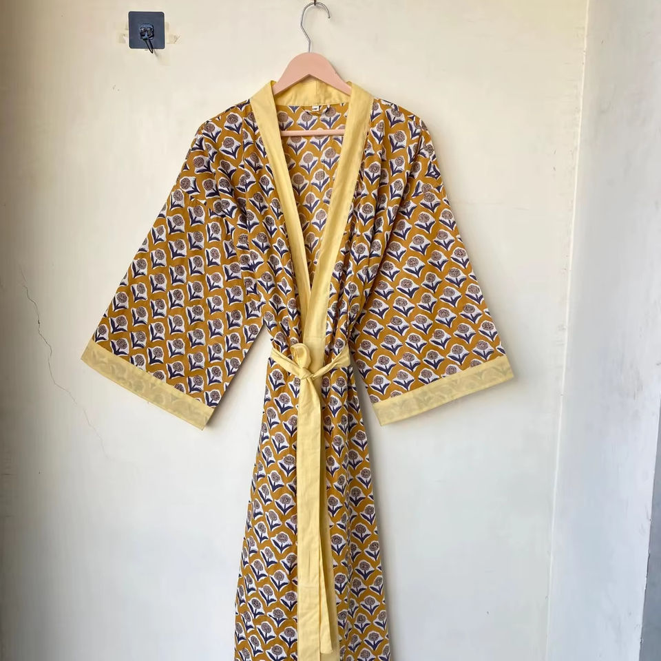 Pure Cotton Block Print Floral V-neck Knee-Length Eco-Friendly Bridesmaid Robe Nightwear Kimono Handmade Beach Cover Dressing