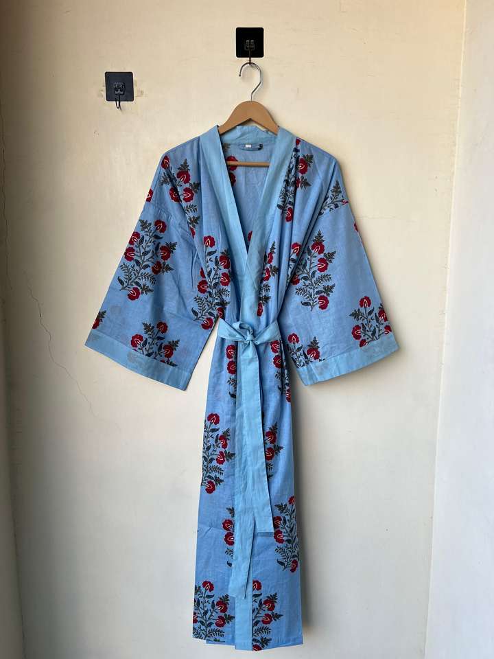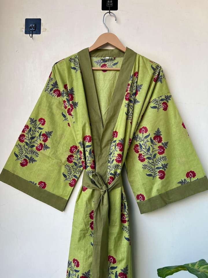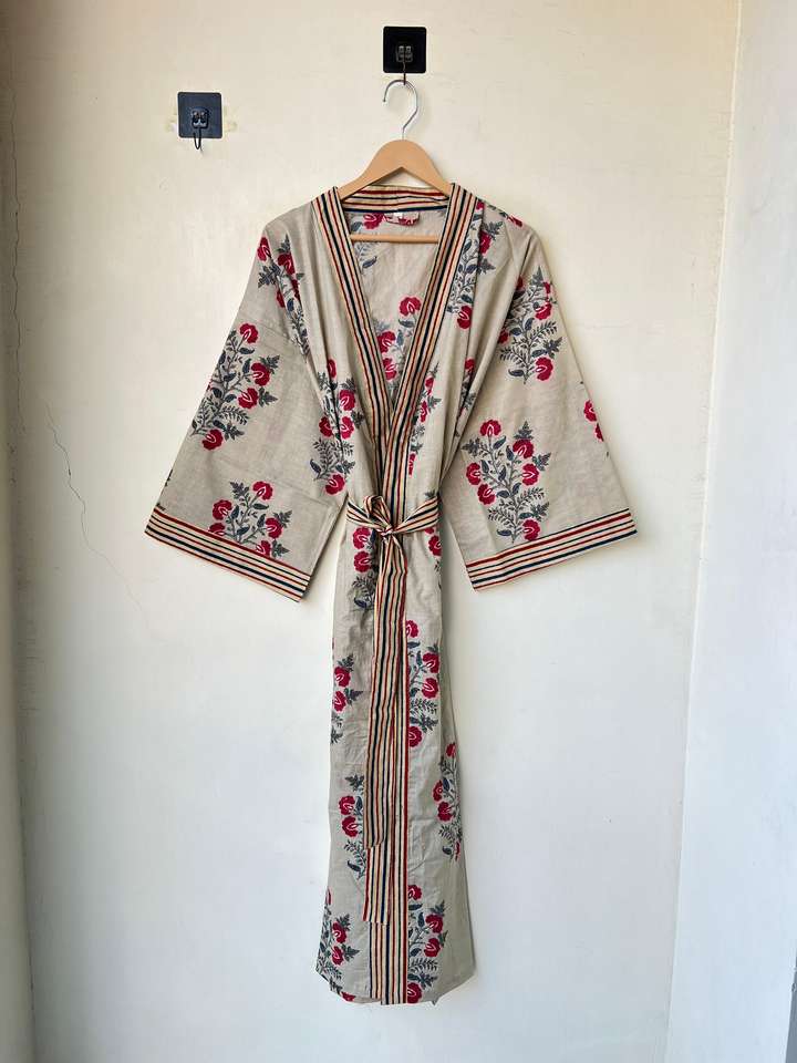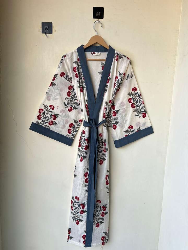 Pure Cotton Block Print Floral V-neck Knee-Length Eco-Friendly Bridesmaid Robe Nightwear Kimono Handmade Beach Cover Dressing
