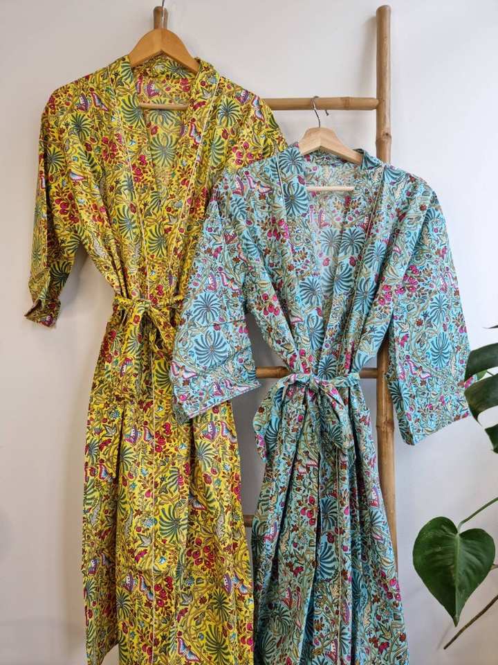 Pure Cotton Indian Block Printed House Robe Summer Kimono Floral Beach Coverup Comfy Maternity Spring Blue Turquoise