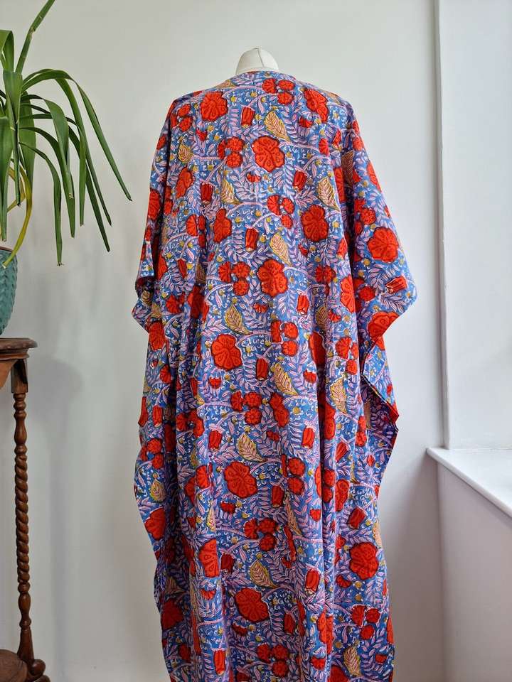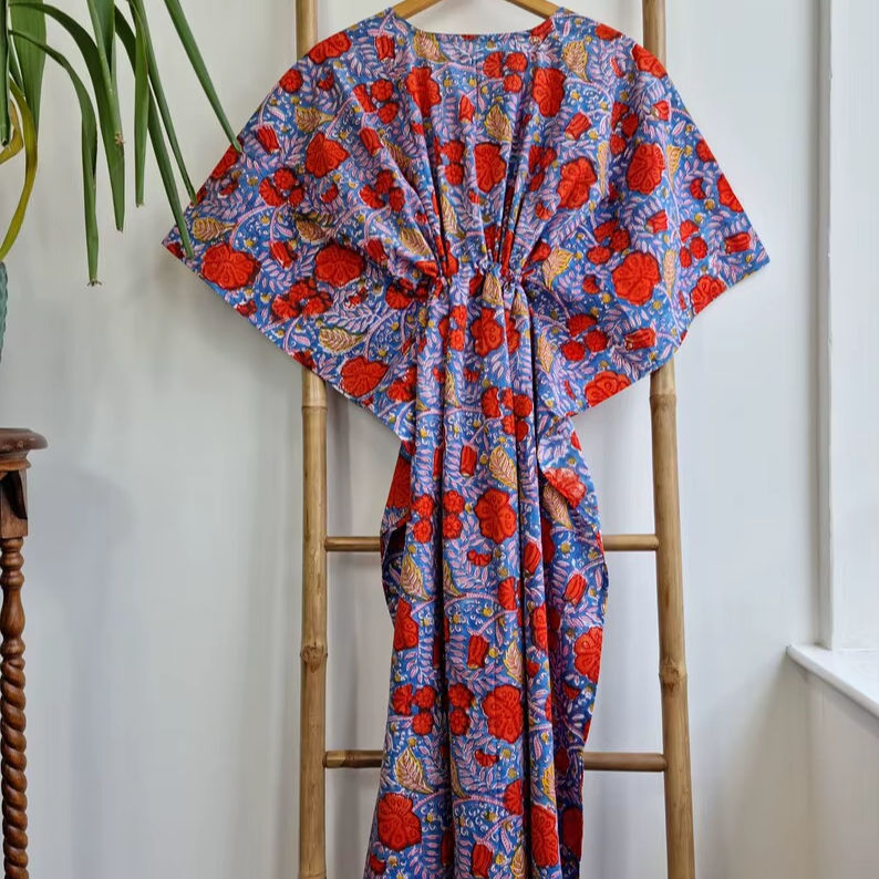 Pure Cotton Kaftan Indian Block Printed Summer Kimono Floral Beach Coverup Comfy Maternity Summer Soft Blue Red Mustard Pink