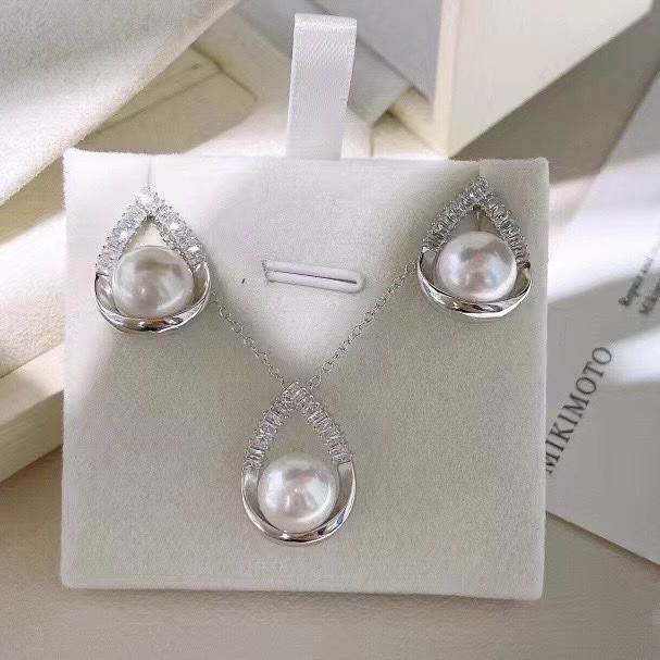 Pure Silver Fashion Jewelry Set with Natural 9-10mm Pearl Earrings 11-12mm Round Flawless Front Pendant 11-12mm Chain Included"