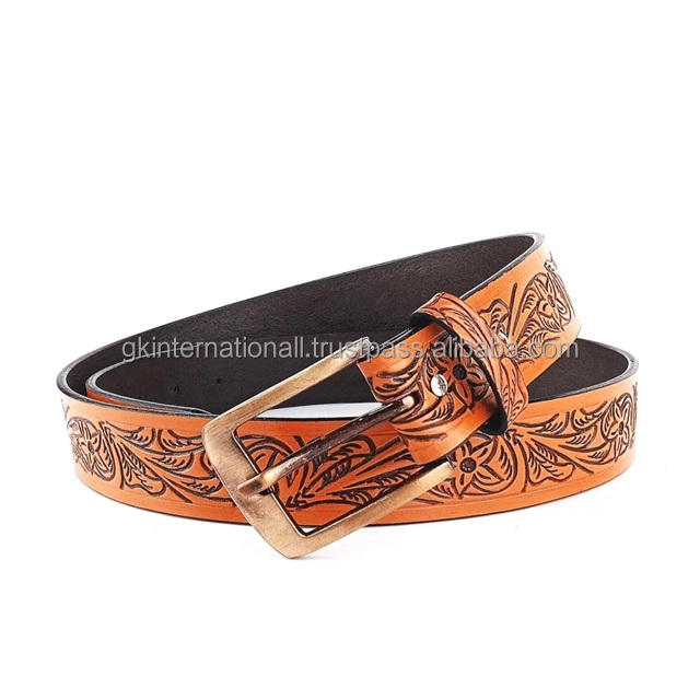 Pure Tan Finish Western Leather Tooling belt with Floral Embossed hand carving tooled leather cowboy belt brass buckle set