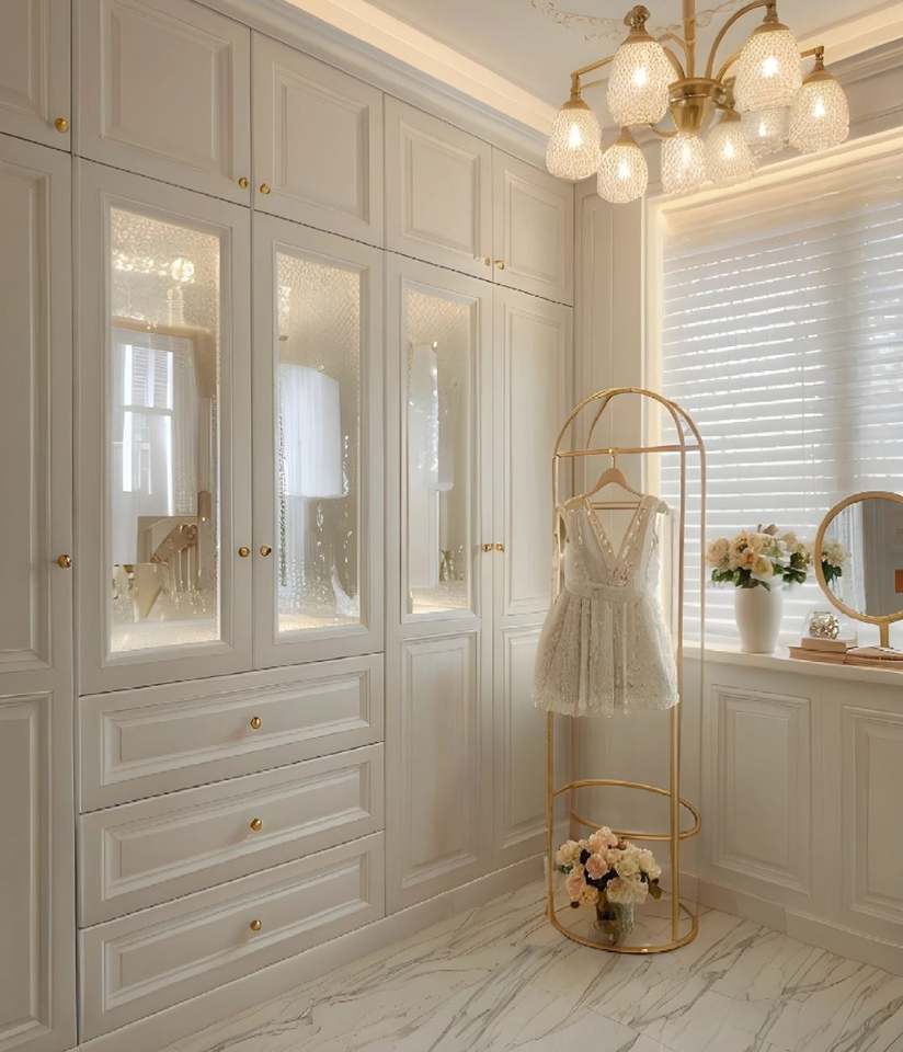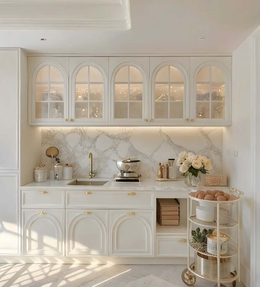 Pure White French Style Modular Kitchen Cabinets Glass Eco-Friendly Moulding Lines Baked Painted Pantry Customized Dining Room