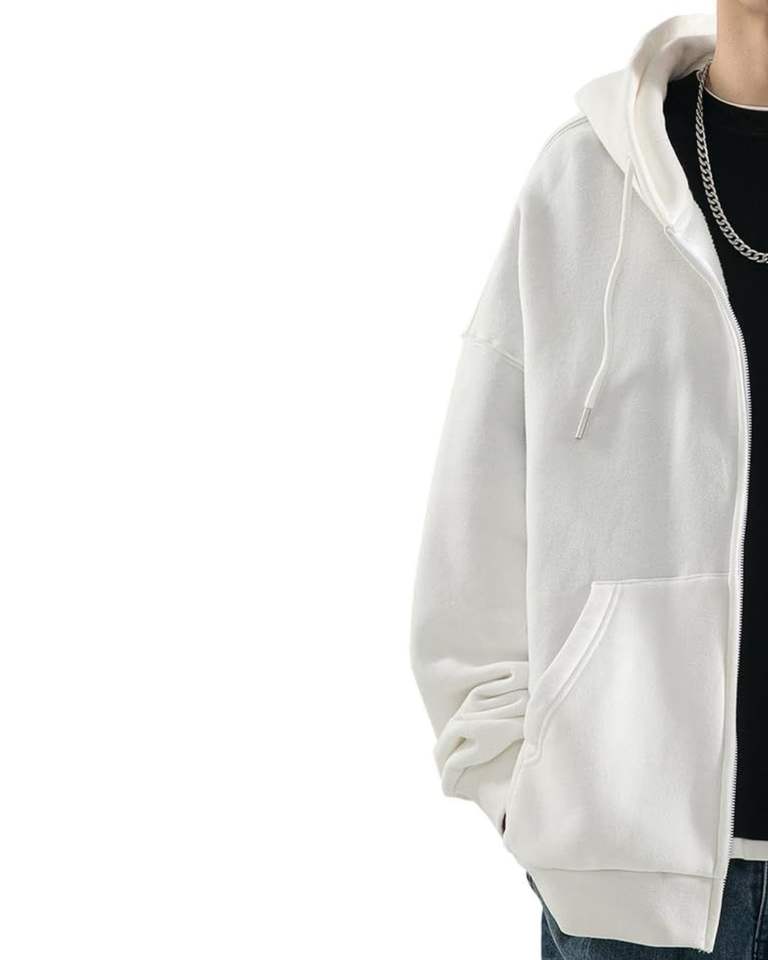 Pure White Oversized Zip Up Hoodie With Kangaroo Pocket Casual Unisex Soft Thick Fleece Streetwear Minimal Fashion Jacket