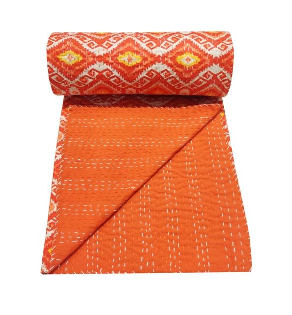 Purely Handcrafted Vintage Kantha Queen Size Bedspread Indian Handmade Quilts Orange Color Ikat Print Eco-friendly Wholesale OEM