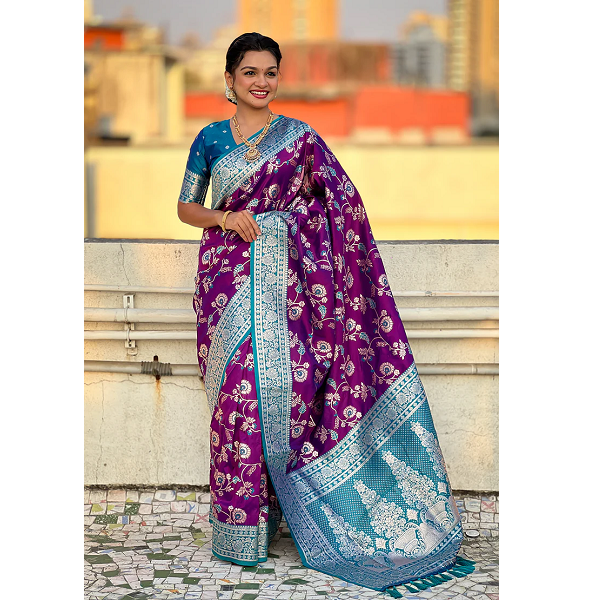 Purple Banarasi Soft Silk Saree with Contrast Jaal Design and Rich Zari Weaving Traditional Winter Party Wear Women's